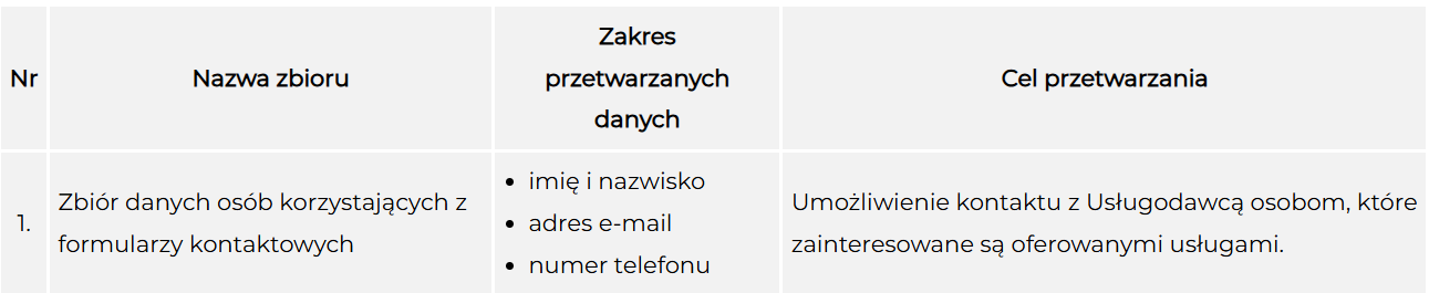 Administrator przetwarza dane osobowe Użytkowników serwisu internetowego akro-nieruchomosci.pl w następujących zbiorach: